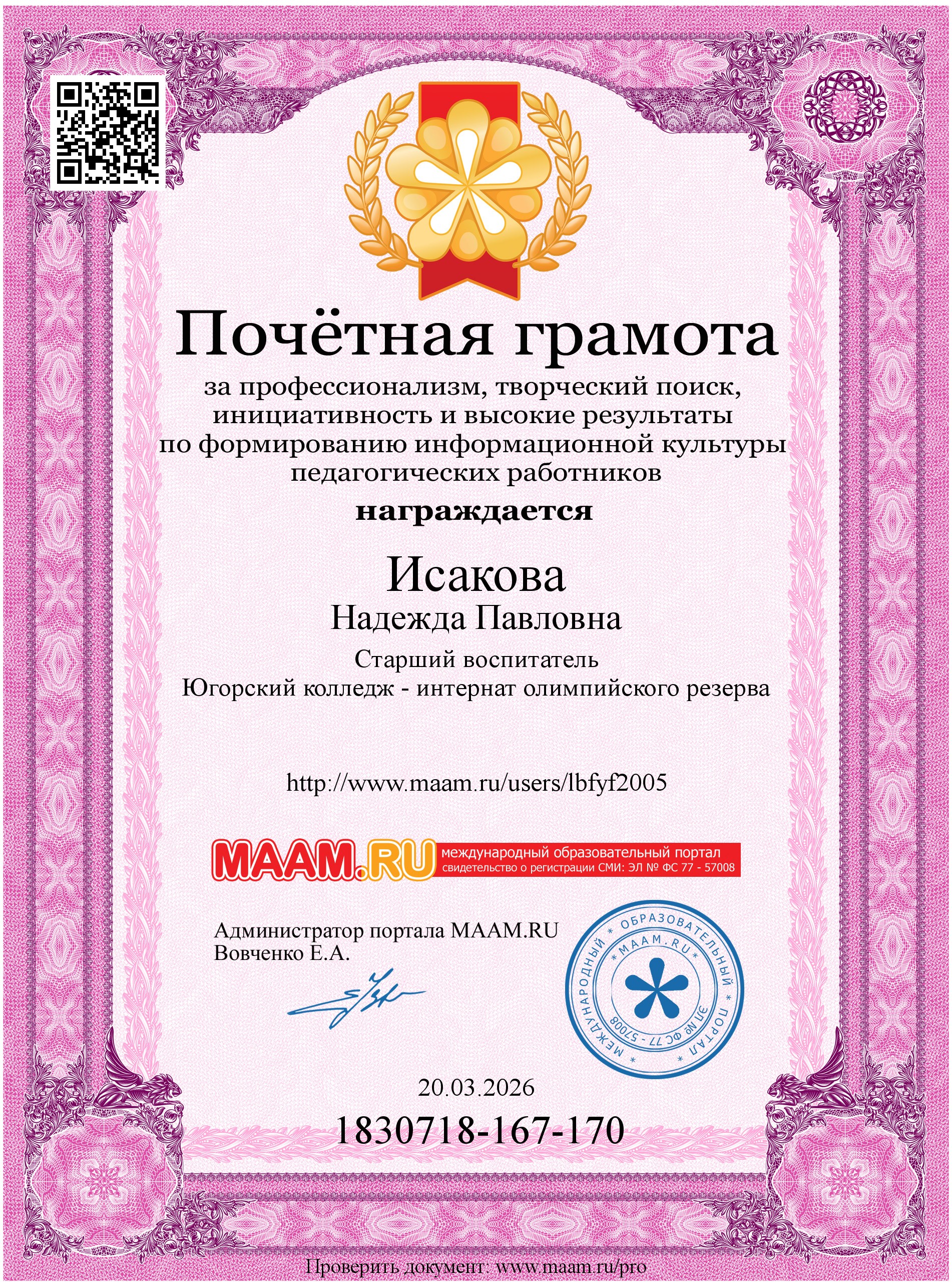 Почетная грамота ДО Администрации г. Ханты-Мансийска