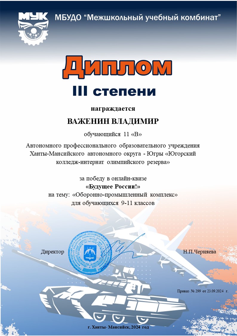 Диплом 1 место викторина Блокадный Ленинград Глеб С. Диплом 1 место Всерос. спортивный конкурс Глеб С. Диплом 1 место Изумрудный город Егор В. Диплом 1 место, конк. Моя Югра Максим Я. Диплом 1 степ. Виктор. Мы за здор. образ жизни Тимофей К. Диплом 1 степени Конкурс Гордость страны Егор В. Диплом 1 степени Тимофей К., Глеб С. Диплом 1 степени, Изумрудный город, Тимур С. Диплом 2 место Изумрудный город Матвей К. Диплом 2 степени Квиз Будущее России Артур С. Диплом 2 степени Квиз Будущее России Ярослав Ч. Диплом 3 степени Квиз Будущее России Владимир В. Диплом 3 степени Квиз Будущее России Егор В. Диплом 1 степени конк.Гордость страны Ярослав Ч. Сертификат. Викторина к снятию блокады Ленинграда Елисей П. Сертификат. Космич. диктант. Тимур С. Диплом за участие в конкурсе Альтернативная елка Сычев Г., Колисниченко Т. |