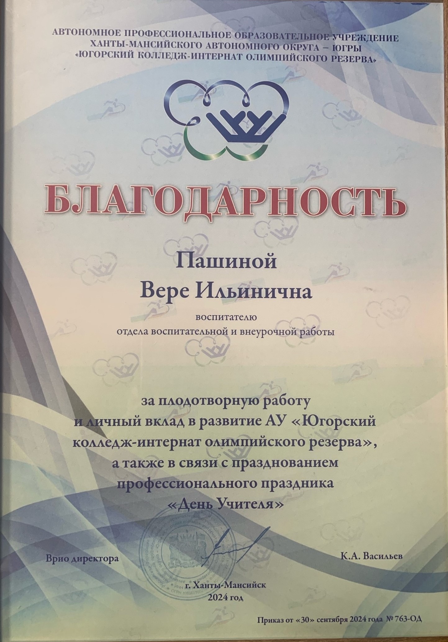 | 4.11. | Наличие отмеченных профессиональных достижений (государственные награды, почетные звания, отраслевые знаки отличия) | Благодарность АУ "ЮКИОР", 2024 |
