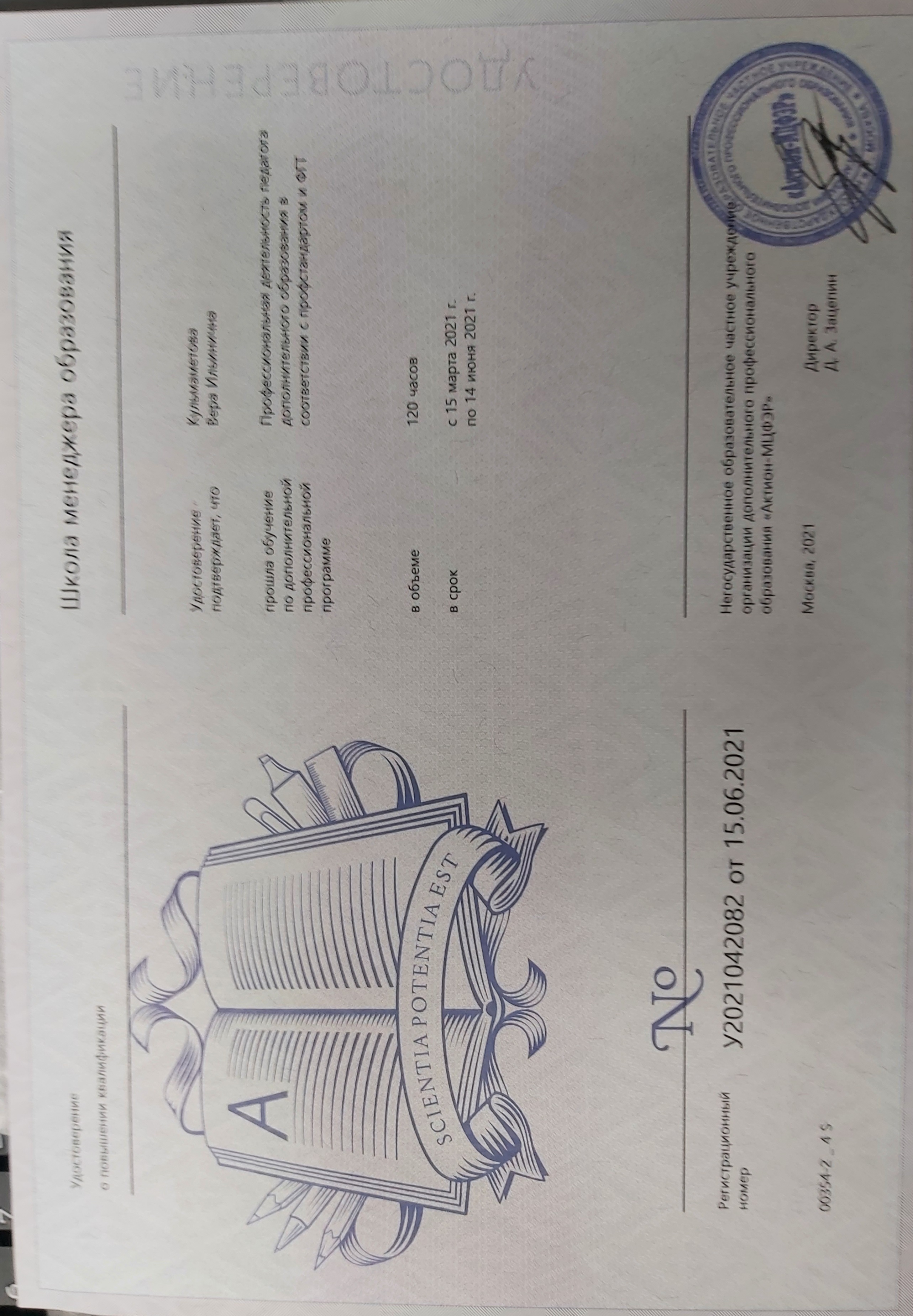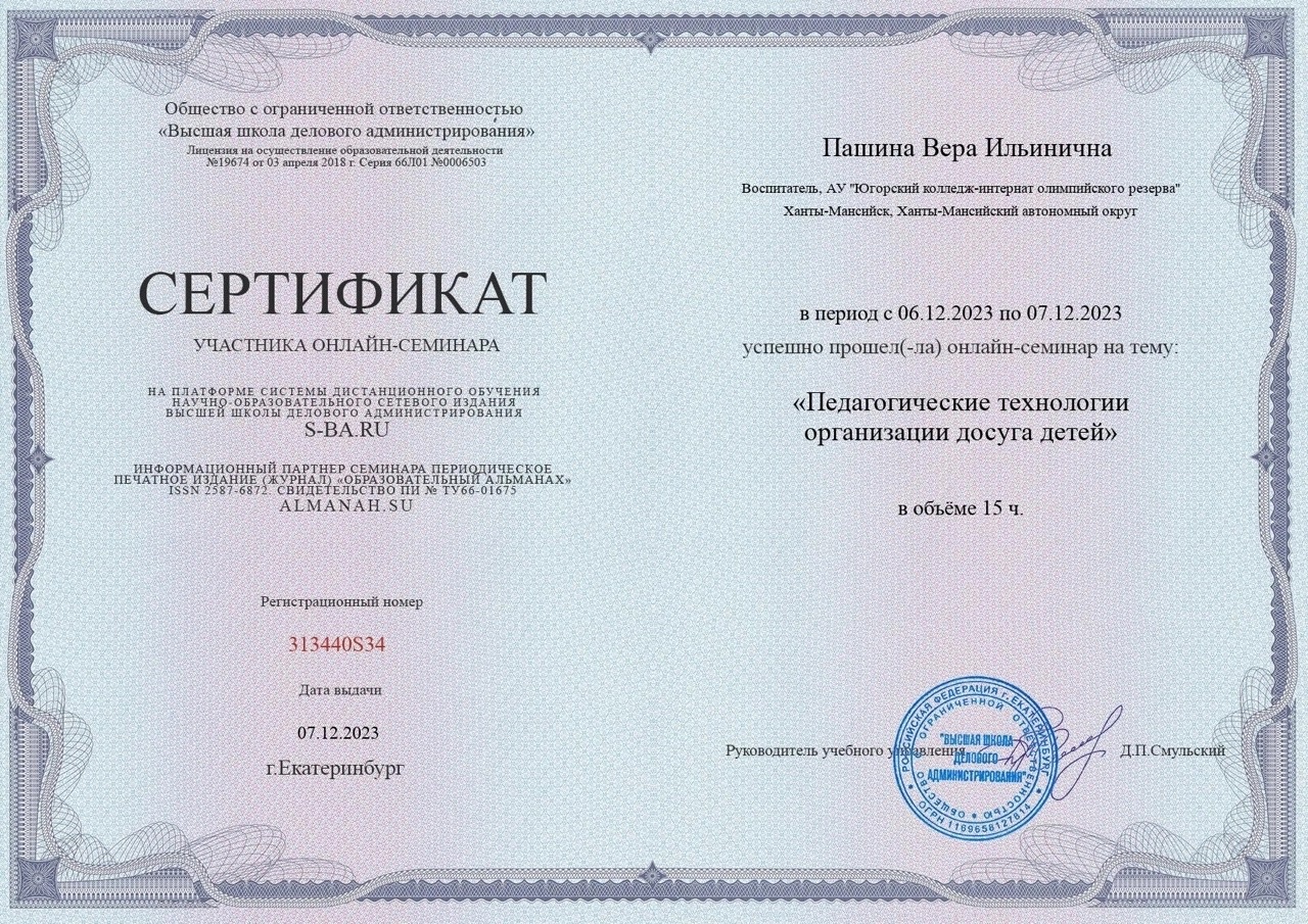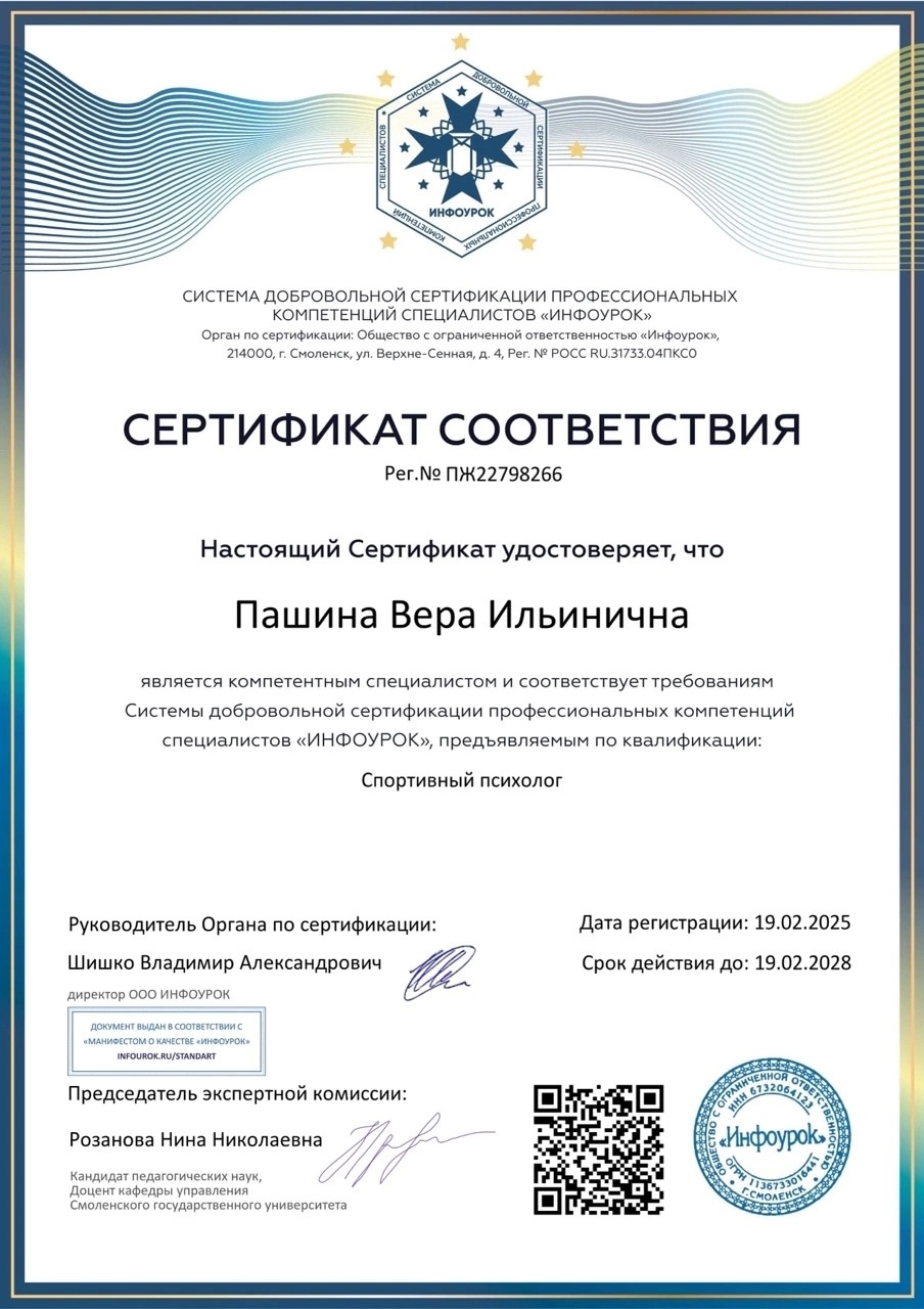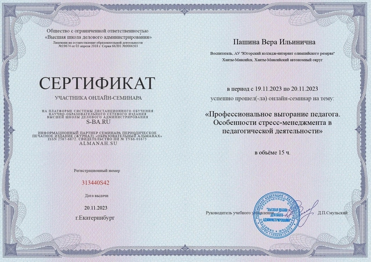 | Наличие образования по профилю профессиональной деятельности. Соответствие дополнительного профессионального образования, профилю профессиональной деятельности. | Диплом о высшем образовании Профессиональная переподготовка ПП Психологическое консультирование в спорте Курсы повышения квалификации ПК Основы организации работы по рпедупреждению безнадзорности ПК Проектирование воспитательной деятельности ПК Профессиональная деятельность педагога ДО ПК Сопровождение детей при перевозке автотранспортом Самообразование Вебинар Нейропсихология эмоций Конференция Особенности выявления семей, находящихся в социально-опасном положении Курс Развитие эмоционального интеллекта обучающихся Курс Эффективные стратегии саморазвития Онлайн-мероприятие Творческий подход к преподаванию Онлайн-семинар Педтехнологии организации досуга детей Онлайн-семинар Профессиональное выгорание педагога. Особенности стресс-меннеджмента Онлайн-семинар Развитие памяти ребенка Педчтения Планирование работы по профилактике правонарушений Семинар Традиционные формы правового просвещения школьников |