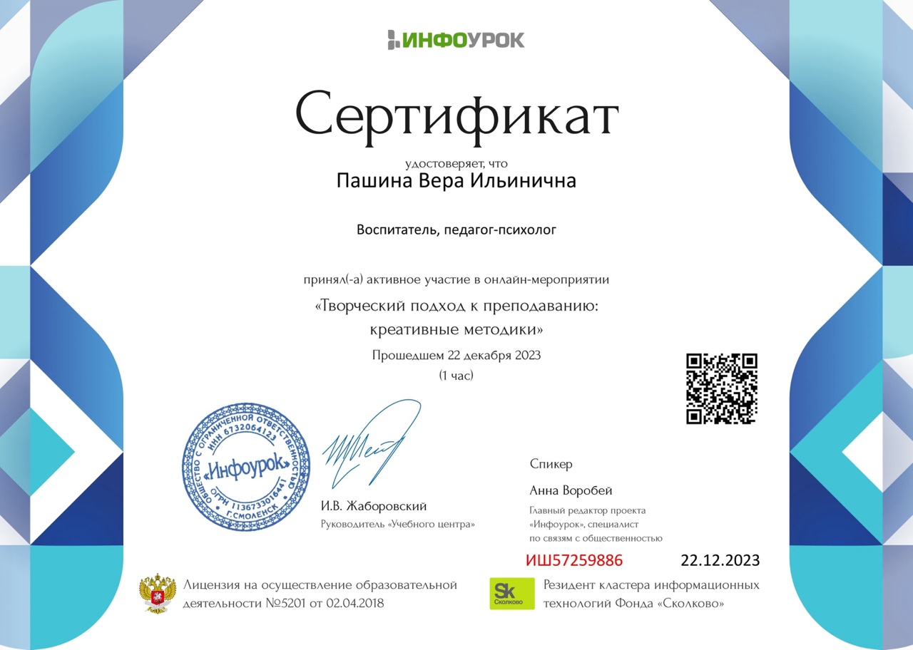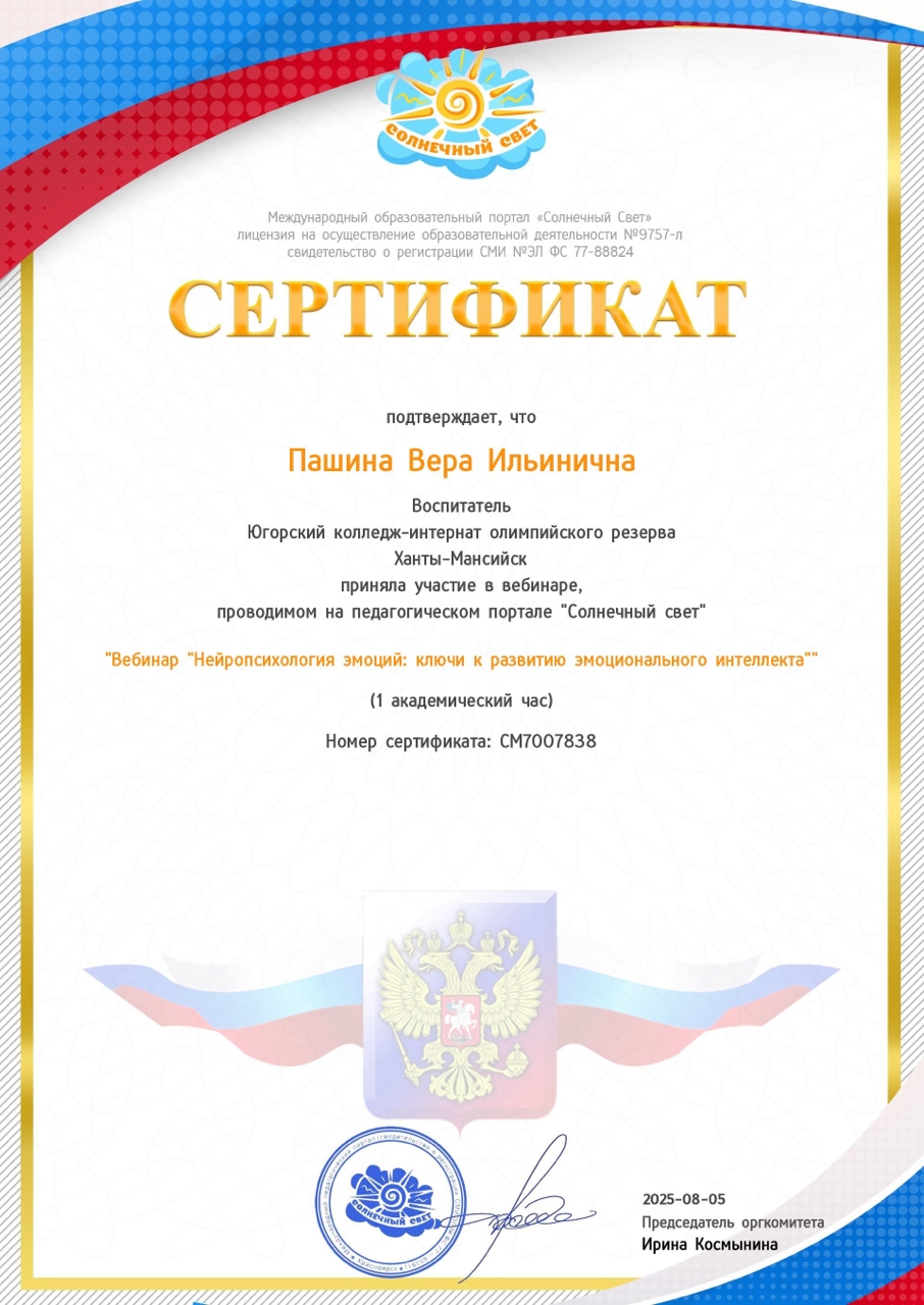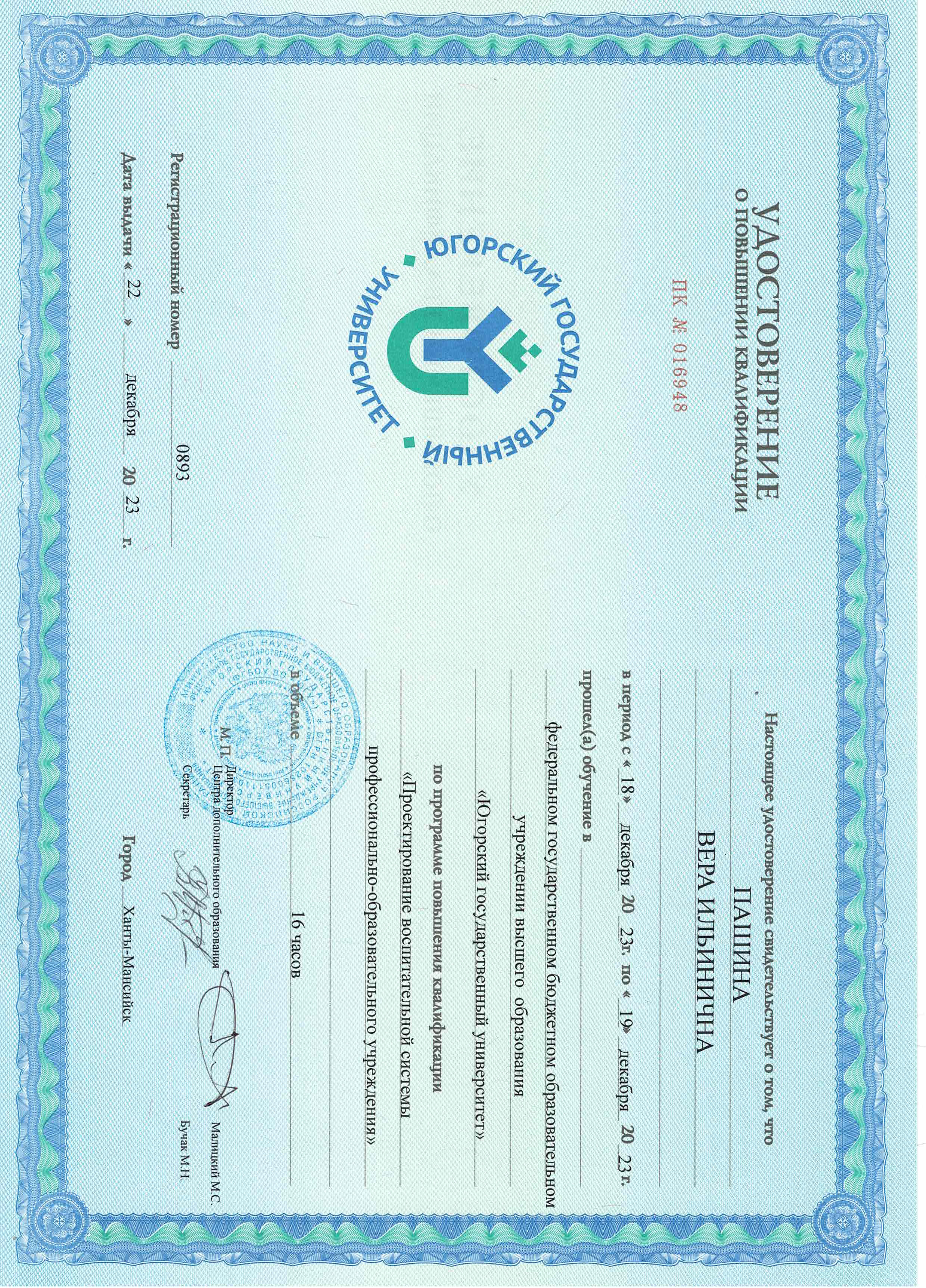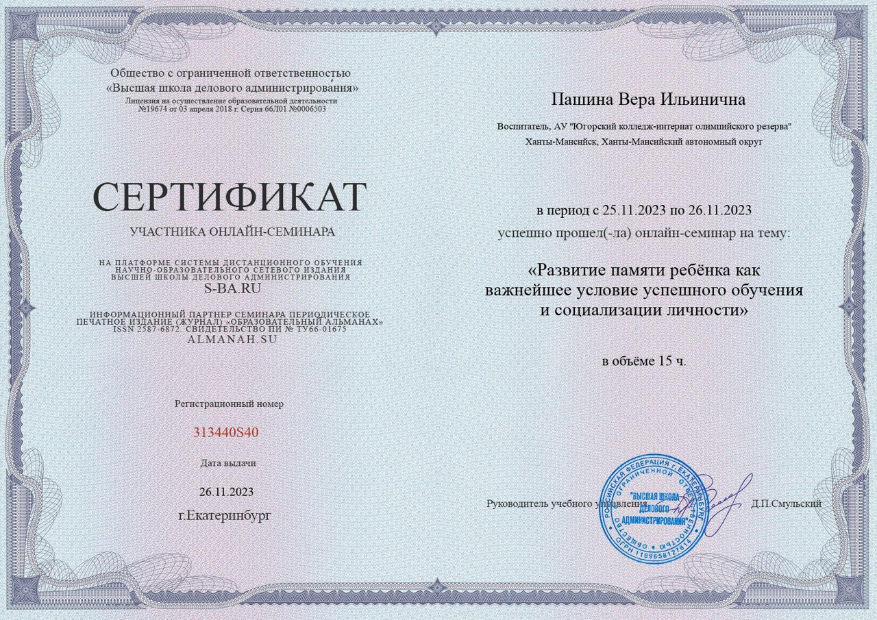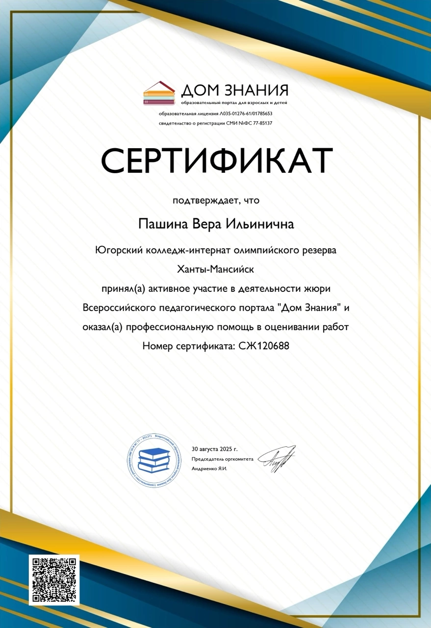 | Наличие образования по профилю профессиональной деятельности. Соответствие дополнительного профессионального образования, профилю профессиональной деятельности. | Диплом о высшем образовании Профессиональная переподготовка ПП Психологическое консультирование в спорте Курсы повышения квалификации ПК Основы организации работы по рпедупреждению безнадзорности ПК Проектирование воспитательной деятельности ПК Профессиональная деятельность педагога ДО ПК Сопровождение детей при перевозке автотранспортом Самообразование Вебинар Нейропсихология эмоций Конференция Особенности выявления семей, находящихся в социально-опасном положении Курс Развитие эмоционального интеллекта обучающихся Курс Эффективные стратегии саморазвития Онлайн-мероприятие Творческий подход к преподаванию Онлайн-семинар Педтехнологии организации досуга детей Онлайн-семинар Профессиональное выгорание педагога. Особенности стресс-меннеджмента Онлайн-семинар Развитие памяти ребенка Педчтения Планирование работы по профилактике правонарушений Семинар Традиционные формы правового просвещения школьников |