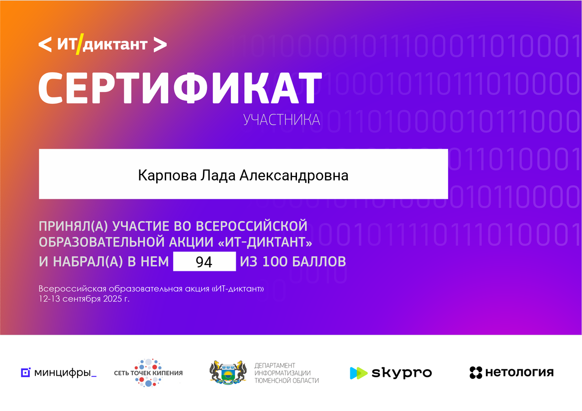 Свидетельство участника Подарок медведю Степану Тимофей Т. Сертификат Всероссийская акция Диктант здоровья Вероника У. Сертификат Всероссийская акция Диктант здоровья Виктория К. Сертификат Всероссийская акция Диктант здоровья Ксения К. Сертификат Всероссийская акция Диктант здоровья Маргарита Ф. Сертификат Всероссийская акция Диктант здоровья Марина Б. Диплом победителя Альтернативная елка Виктор Б. Диплом победителя Конкурс Алтернативная елка Айдар М. Диплом победителя Конкурс Алтернативная елка Дарья Б |