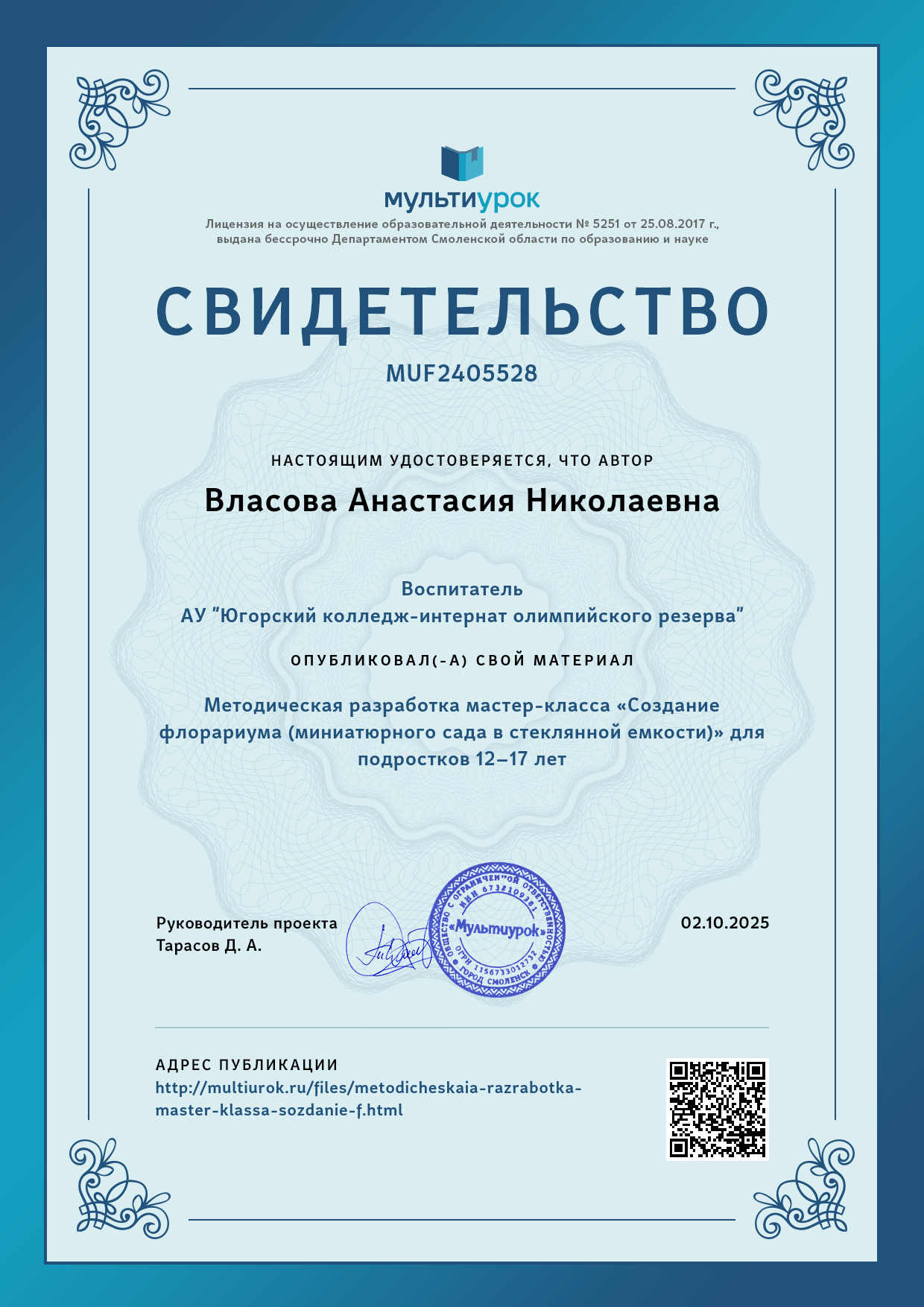Свидетельство Методическая разработка мастер-класса «Создание флорариума (миниатюрного сада в стеклянной емкости)» для подростков 12–17 лет