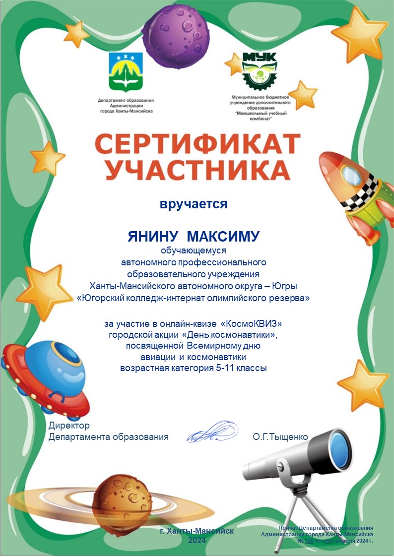 Сертификат участника Космич. диктант Илья А. Сертификат участника, Космоквиз, Максим Я. Участие во Всерос. олимпиаде Сталинградская битва Виталий З. Участие во Всерос. олимпиаде Сталинградская битва Владислав Б. Участие во Всерос. олимпиаде Сталинградская битва Захар Щ. Диплом 1 м. Конкурс Команда. Дисциплина. Личность Вадим Г. (Сидорова Е.В.) Диплом 1 место Викторина по литературе Ислам А. (Сидорова Е.В.) Диплом 1 место Основы экологических знаний Василий Д. (Сидорова Е.В.) Диплом 1 место Особенности русских народных промыслов Владислав Р. (Сидорова Е.В.) Диплом 1 место Познавательная виктоирна по астрономии Тимур Н. (Сидорова Е.В.) Диплом 1 место Сила характера - сила страны Сулим М. (Сидорова Е.В.) Диплом 1 место Что я знаю о спорте Алихан Д. (Сидорова Е.В.) Диплом 1 место Викторина по географии Егор С. (Сидорова Е.В.) Диплом1 место Здоровье.Спорт Павел У. (Сидорова Е.В.) Онлайн-курс Артур И. Моя страна-мои возможности |