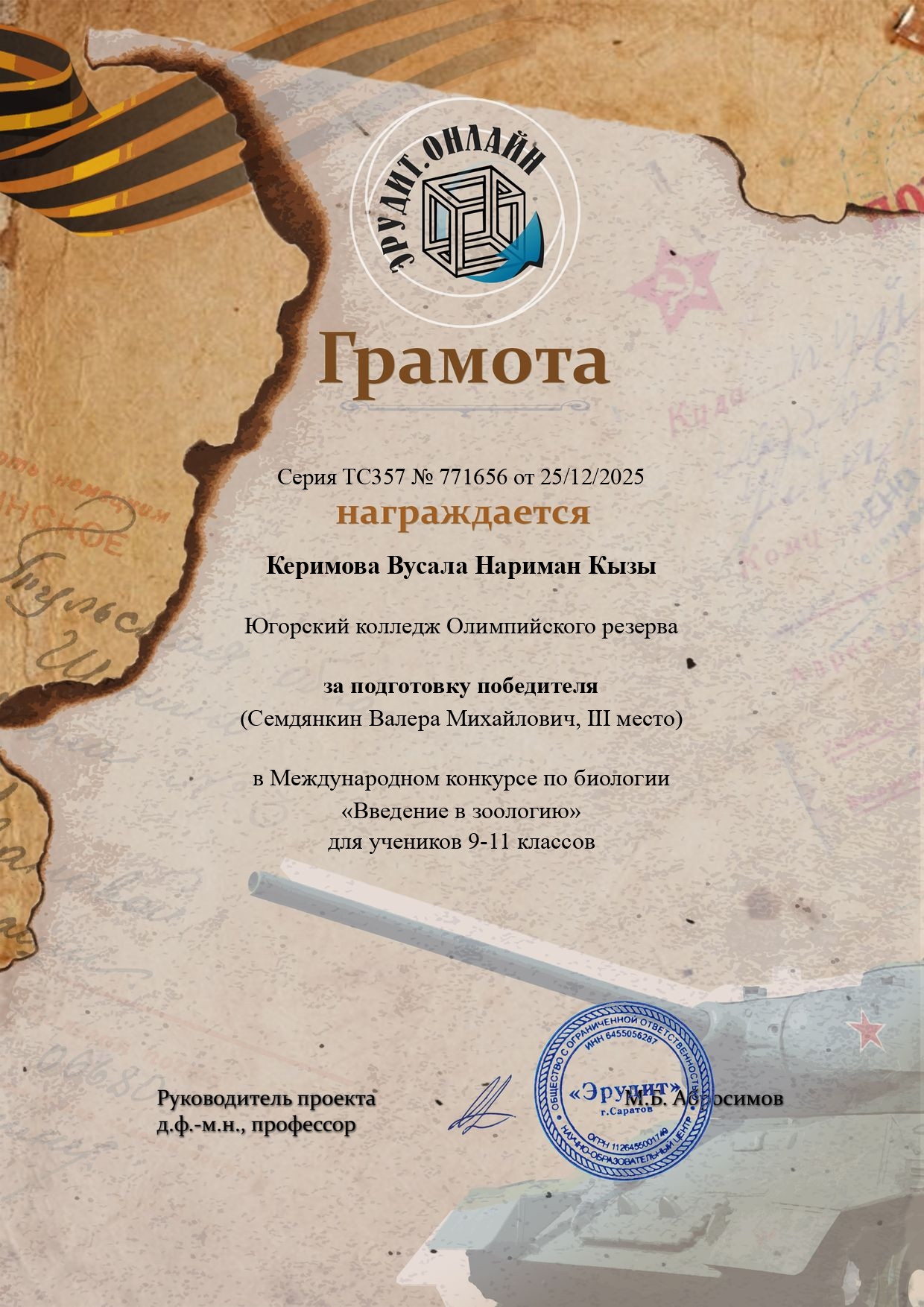 Грамота конкурс по зоологии за подготовку |