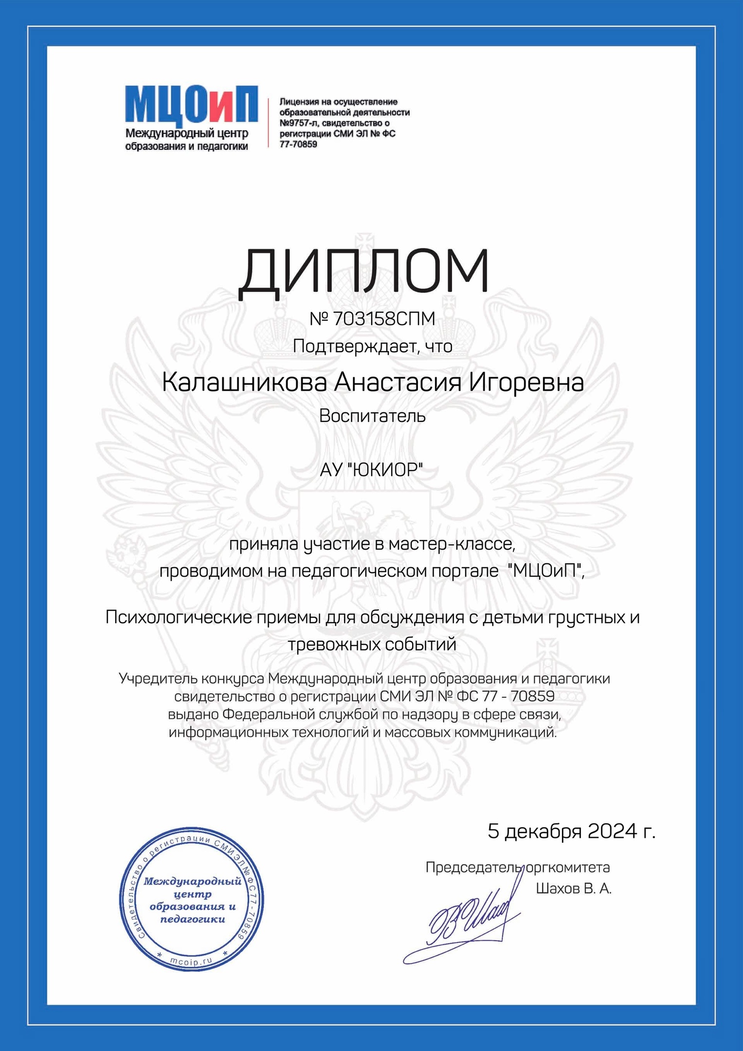 Благодарность ООО Инфоурок за вклад в методическое обеспечение Конспект беседы Безопасность в сети интернет Отчет о результатах деятельности за 2021-2023 гг. Презентация к творческому вечеру А.С. Пушкина Протокол заседания № 3 от 07.04.2025 Результаты деятельности за 2021-2023 гг. Свидетельство о публикации Солнечный свет (профориентационная беседа) Свидетельство о размещении материала (акция Руки добра) Свидетельство о размещении материала (конспект мероприятия) Свидетельство о размещении материала (профориентационная беседа) Статья Использование игровой деятельности