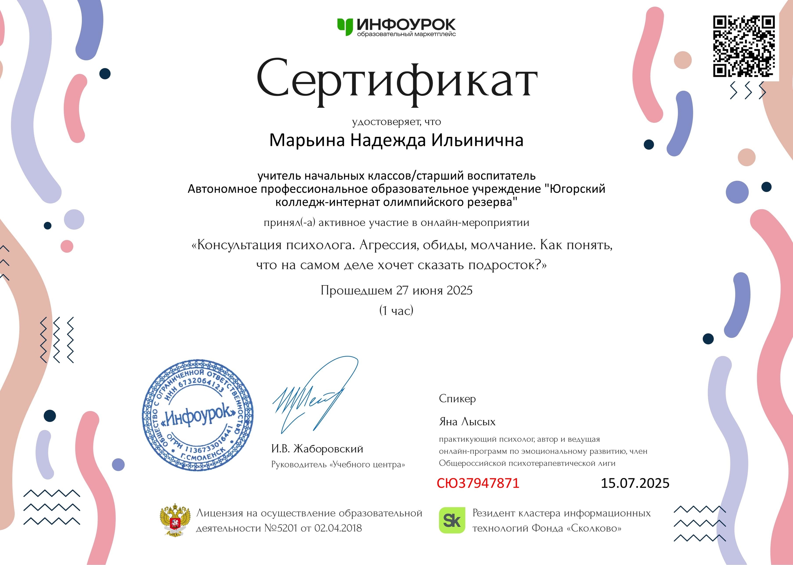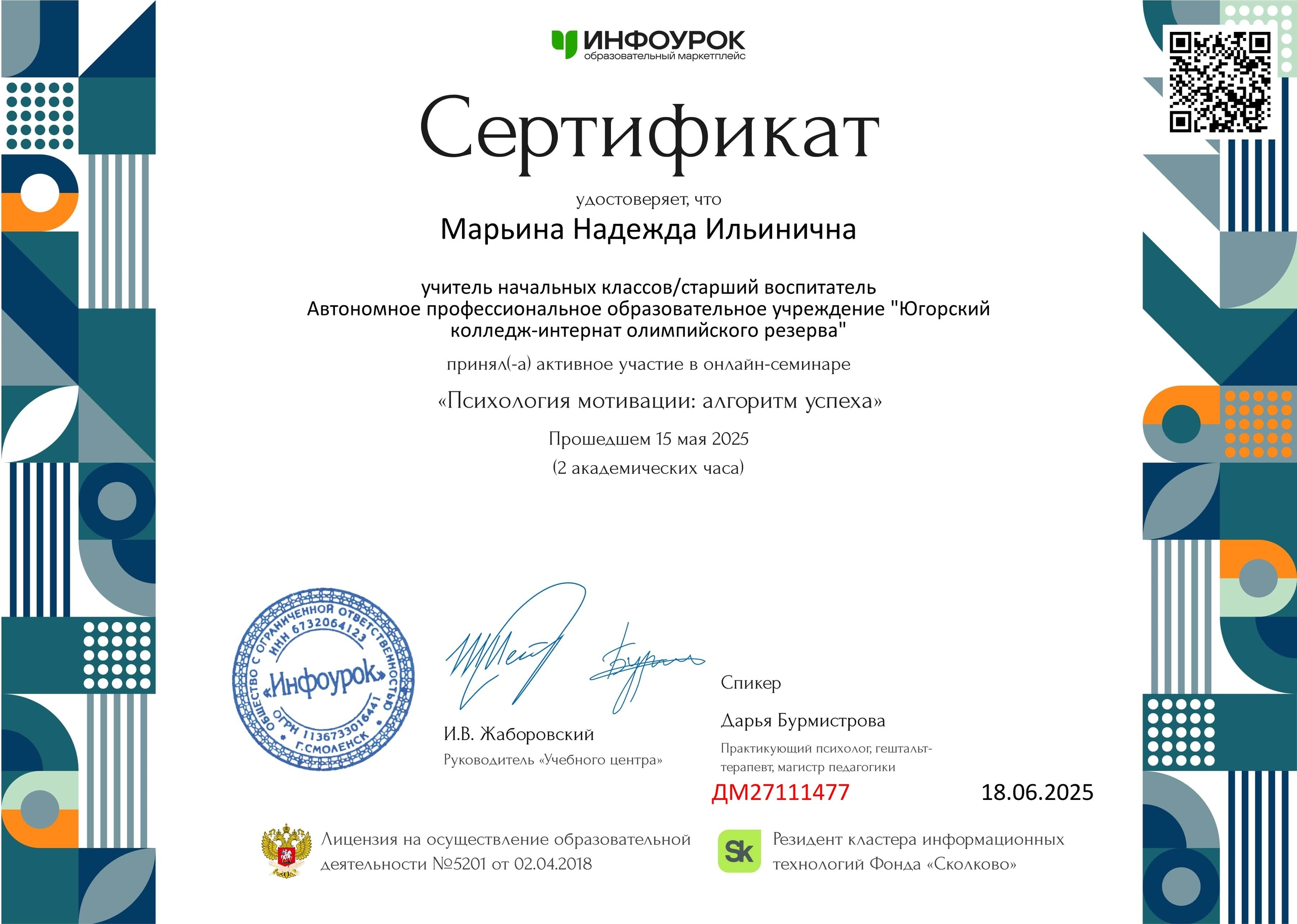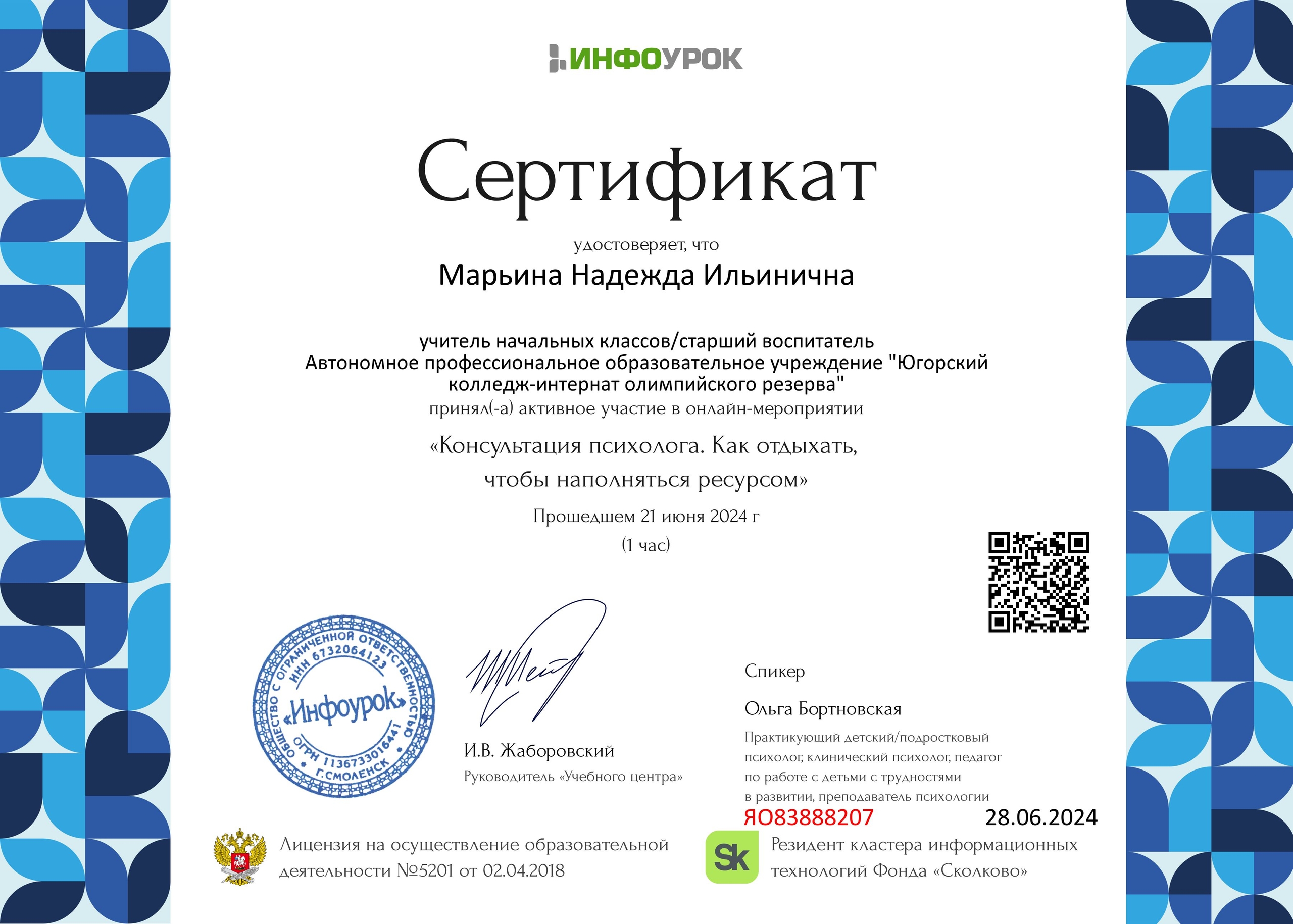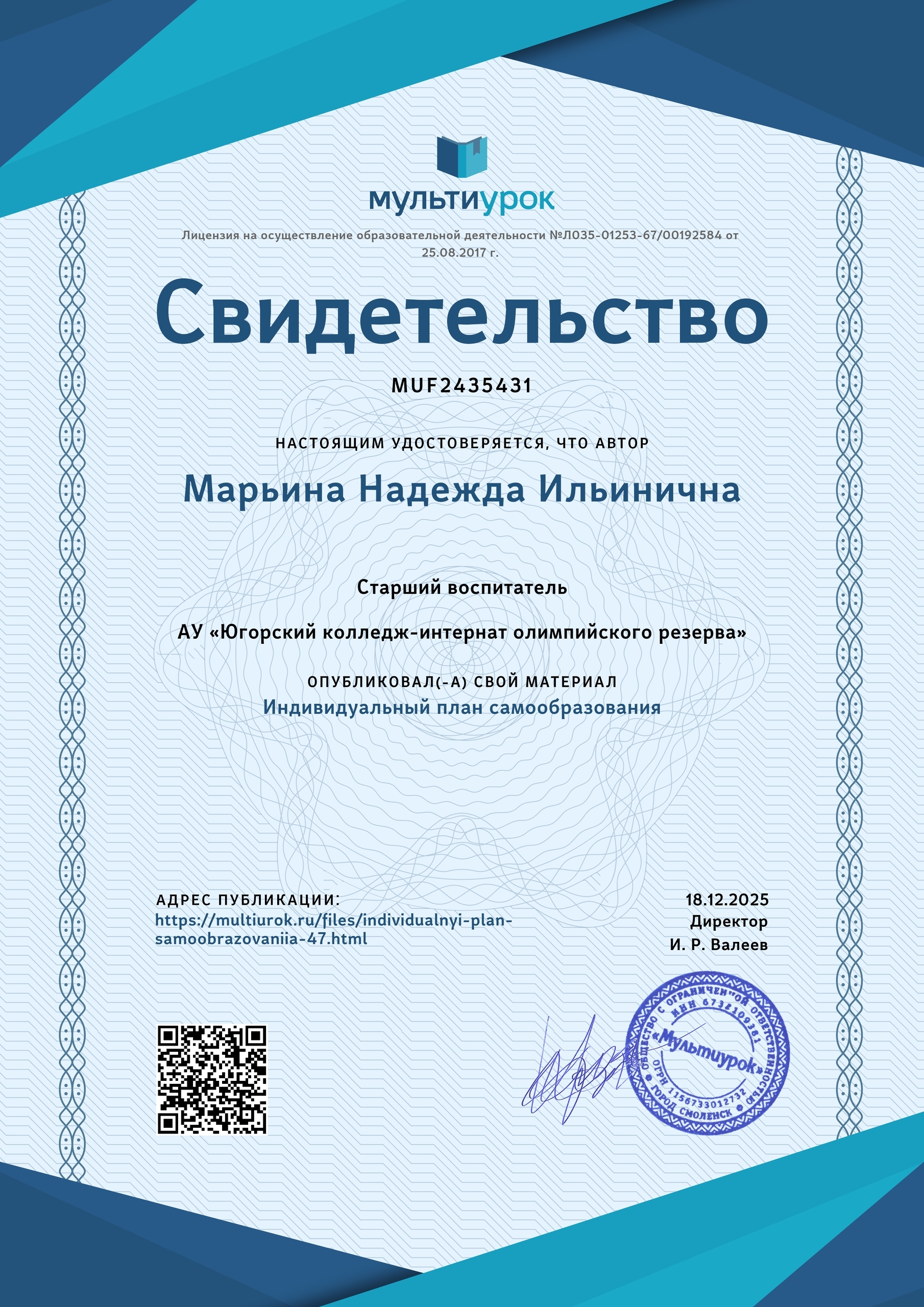 Курсы повышения квалификации: ПК Организация работы с родителями по предупреждению безнадзорности ПК Сопровождение при перевозке автотранспортом Удостоверение по экообразованию ПК Ключевые компетенции воспитателя Самообразование: Конференция Особенности выявления семей находящихся в социально-опасном положении Курс Медиасопровождение в молодежной среде Курс Управление проектами в соц. сфере Курс Экосистема молодежной политики Курс Эффективное целеполагание и планирование Курс Эффективные стратегии саморазвития Педчтения Планирование работы по профилактике правонарушений Семинар Традиционные и инновационные формы правового просвещения Онлайн-мероприятие Консультация психолога. Как отдыхать. Онлайн-мерпориятие Консультация психолога Вебинар особенности образовательной программы Научно-методическая конференция Новые компетенции педагога Пед чтения Работа с семьями детей |