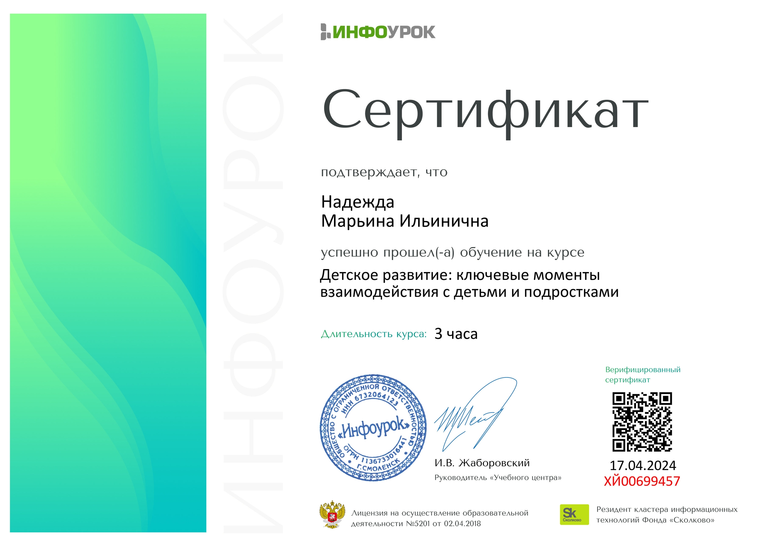Договор о сотрудничестве Центр ремесел Договор посещение арены виртуальной реальности Свидетельство о публикации перспективного плана по речевому развитию Свидетельство о публикации плана самообразования Свидетельство о размещении материала конспект по адаптации детей Свидетельство о размещении материала конспект по развитию речи Свидетельство о размещении материала конспект по творчеству А.Барто Свидетельство о размещении материала КТП группы раннего развития Свидетельство о размещении материала План работы с родителями |
