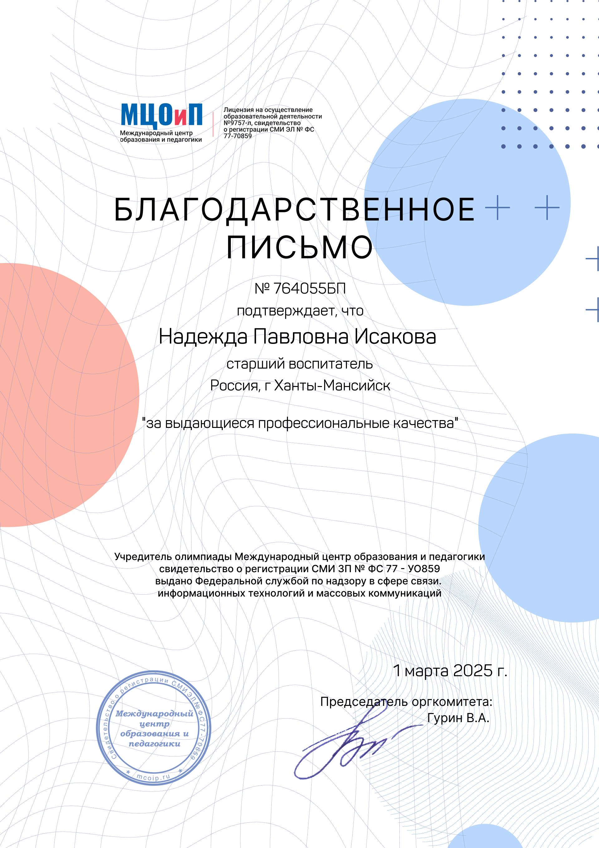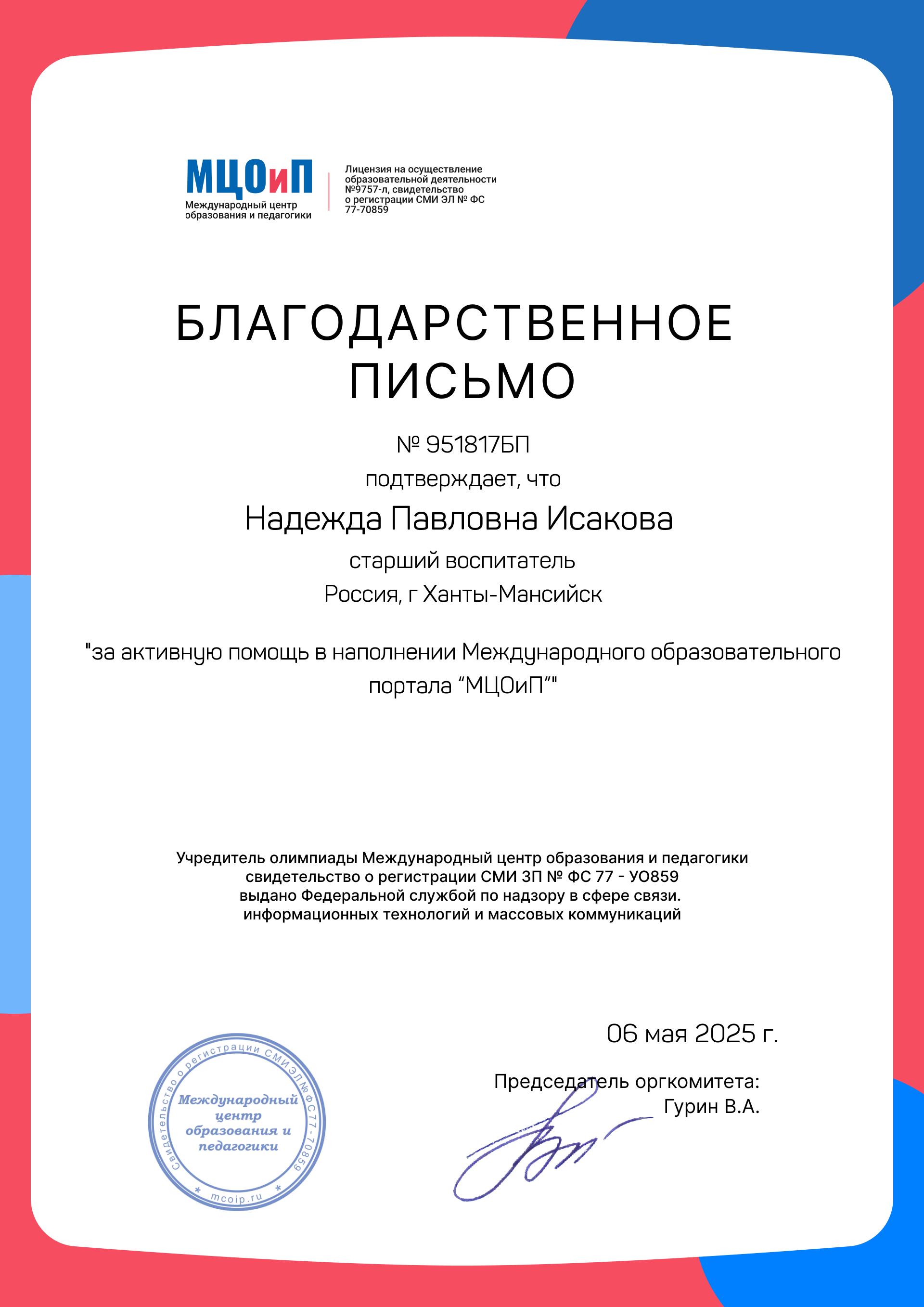 Благодарственное письмо ДО Администрации г. Ханты-Мансийска 2023