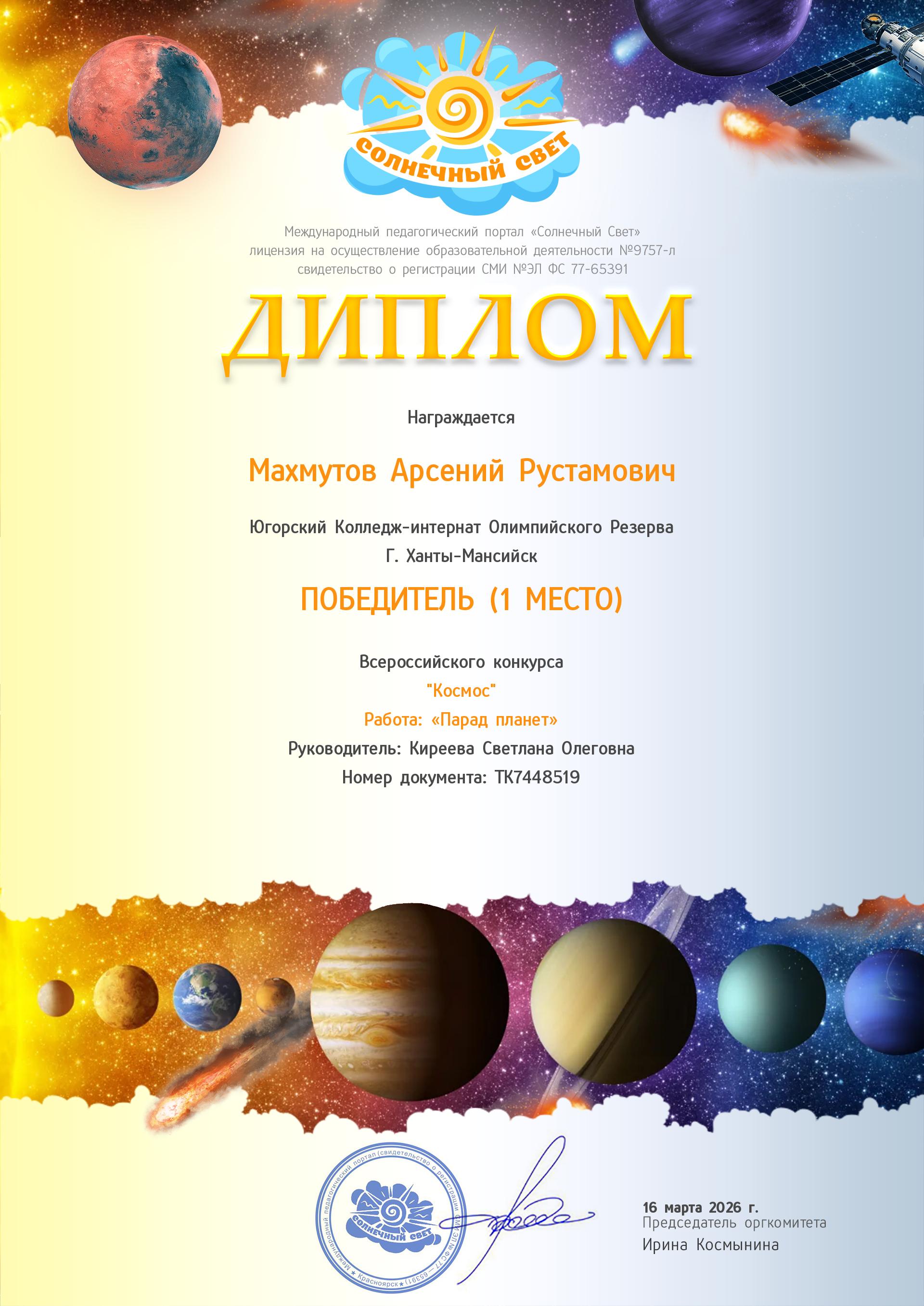 Диплом победителя конк. Космос Арсений М.