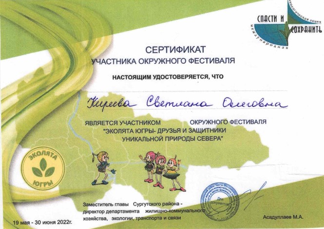 Сертификат участника окр. фестиваля Эколята Югры