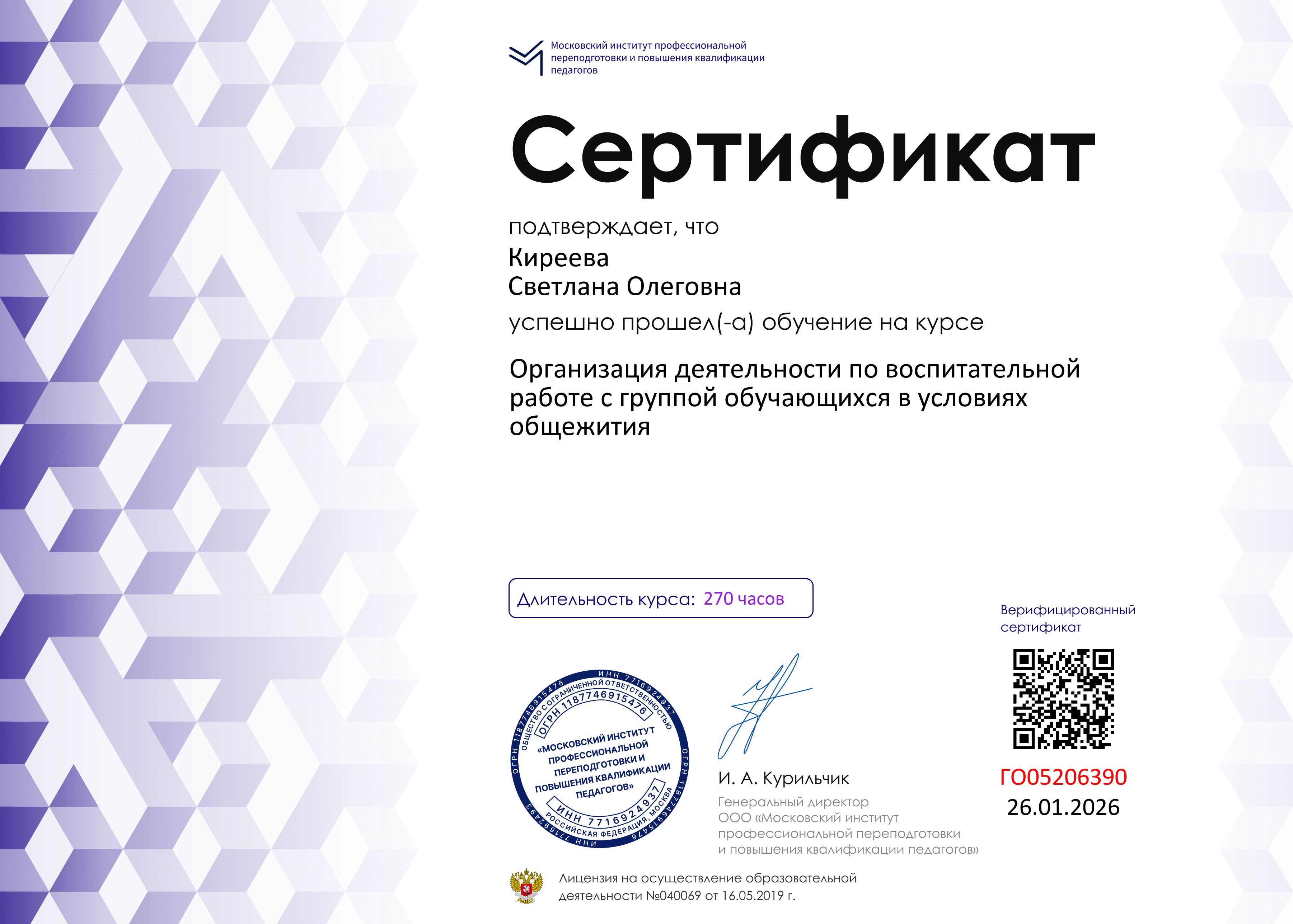 Курс Организация деятельности по ВР - 270 часов