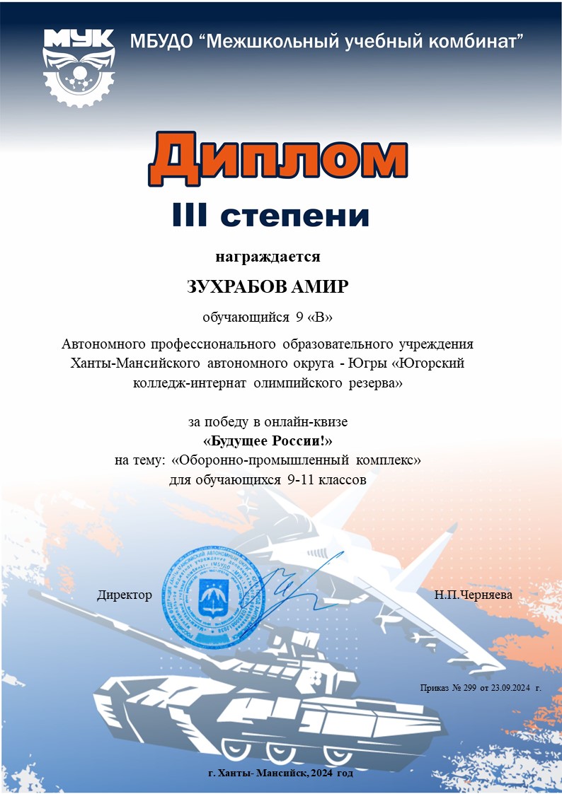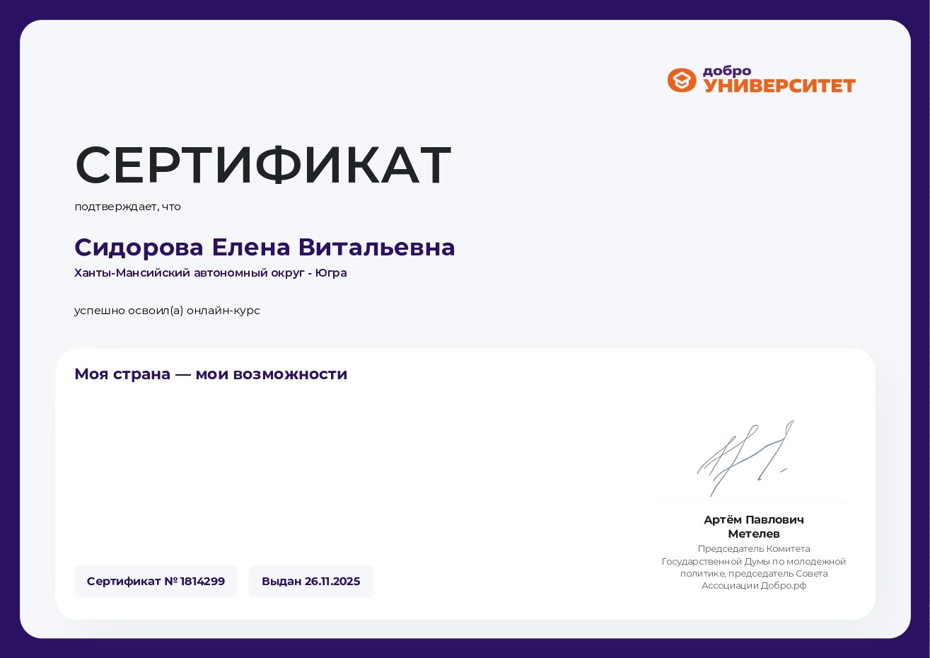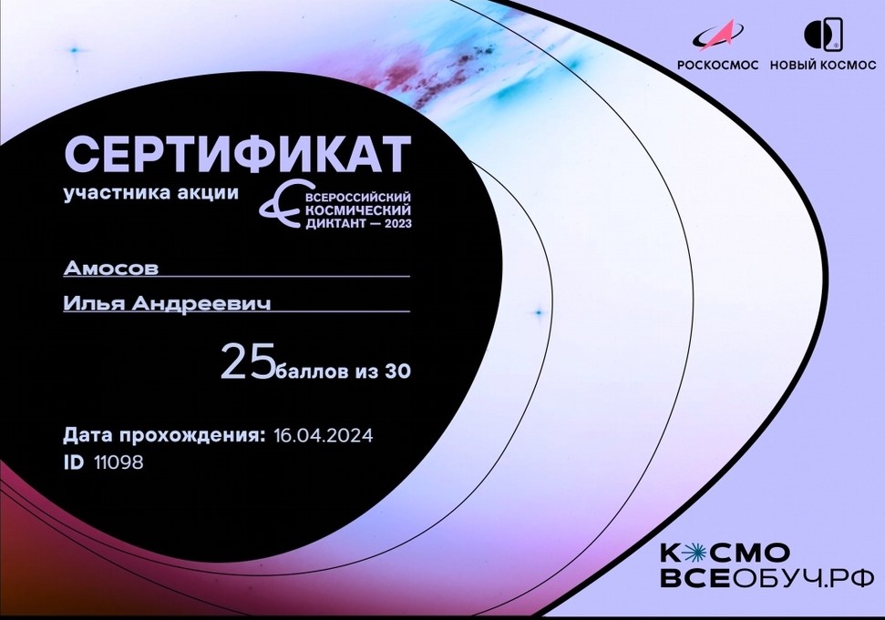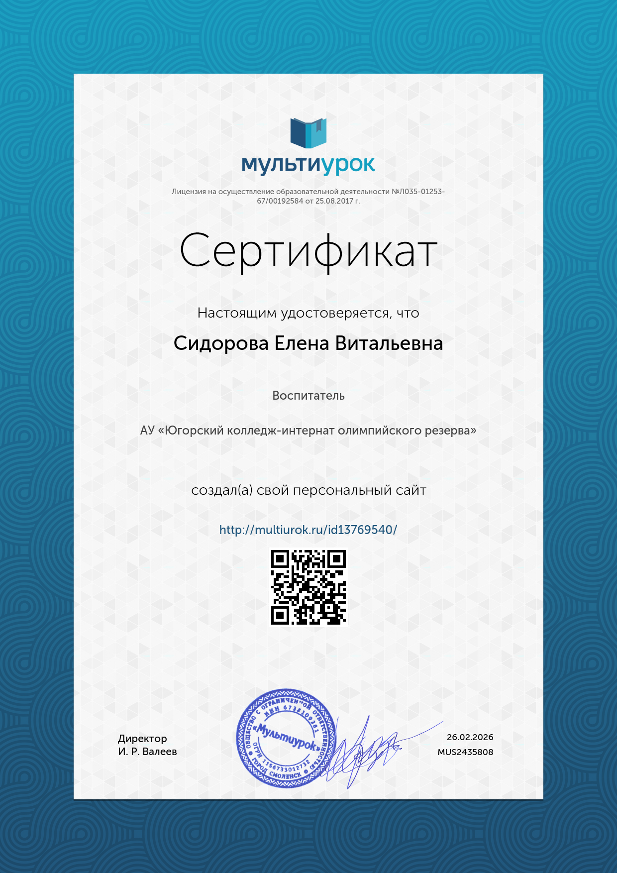 Сертификат участника Космич. диктант Илья А. Сертификат участника, Космоквиз, Максим Я. Участие во Всерос. олимпиаде Сталинградская битва Виталий З. Участие во Всерос. олимпиаде Сталинградская битва Владислав Б. Участие во Всерос. олимпиаде Сталинградская битва Захар Щ. Диплом 1 м. Конкурс Команда. Дисциплина. Личность Вадим Г. (Сидорова Е.В.) Диплом 1 место Викторина по литературе Ислам А. (Сидорова Е.В.) Диплом 1 место Основы экологических знаний Василий Д. (Сидорова Е.В.) Диплом 1 место Особенности русских народных промыслов Владислав Р. (Сидорова Е.В.) Диплом 1 место Познавательная виктоирна по астрономии Тимур Н. (Сидорова Е.В.) Диплом 1 место Сила характера - сила страны Сулим М. (Сидорова Е.В.) Диплом 1 место Что я знаю о спорте Алихан Д. (Сидорова Е.В.) Диплом 1 место Викторина по географии Егор С. (Сидорова Е.В.) Диплом1 место Здоровье.Спорт Павел У. (Сидорова Е.В.) Онлайн-курс Артур И. Моя страна-мои возможности Онлайн-курс Моя страна-мои возможности Виктор С. |