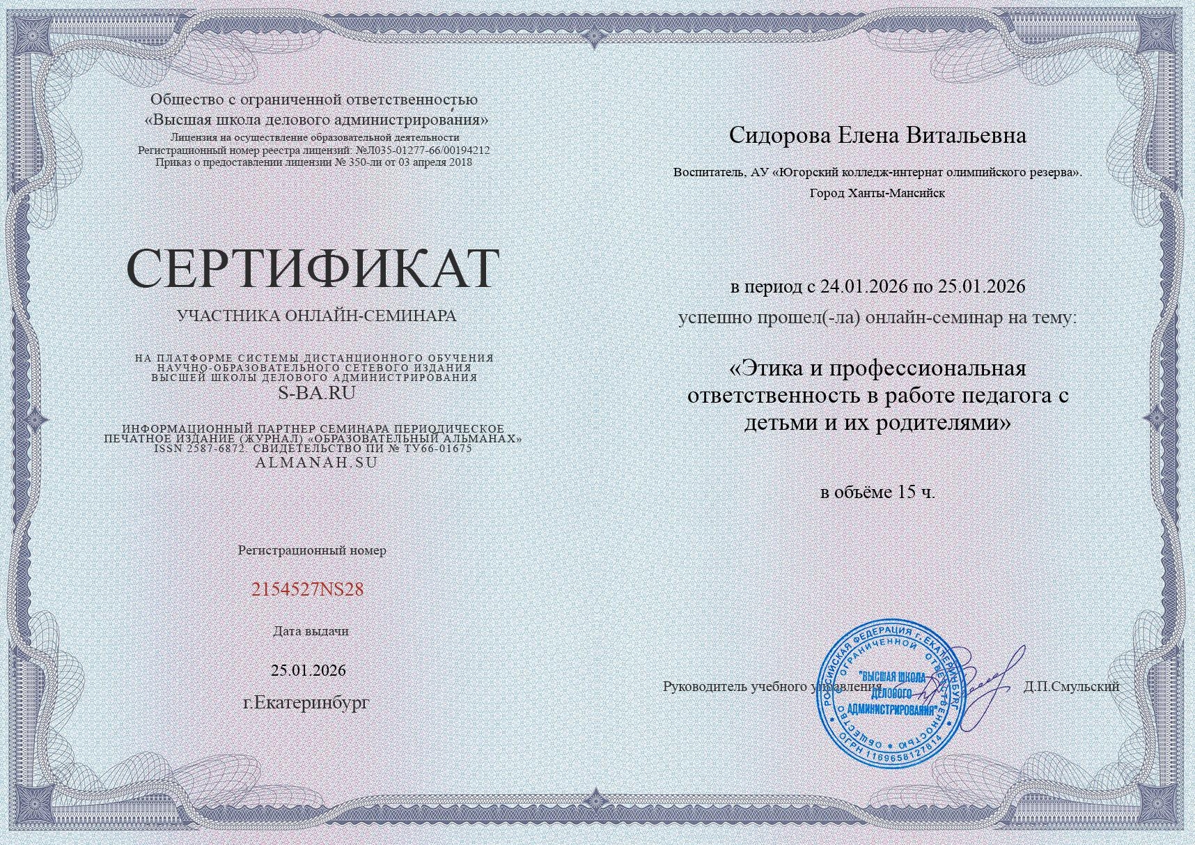 Профессиональная переподготовка ПП Дошкольное образование, 2023 г. Курсы повышения квалификации ПК Организация работы с родителями по предупреждению безнадзорности ПК Сопровождение детей при перевозке автотранспортом Самообразование Вебинар Формы проведения мероприятий для родителей Конференция Особенности выявления семей находящихся в социально-опасном положении Онлайн-курс Моя страна-мои возможности Онлайн-курс Основы волонтерства для начинающих Педчтения Планирование работы по профилактике правонарушений Семинар Традиционные и инновационные формы правового просвещения Вебинар Буллинг в подростковой среде Вебинар Воспитание социально-развитой и гармоничной личности Вебинар Информационная безопасность Вебинар Как заинтересовать воспитанников Вебинар Роль духовно-патриотического воспитания в образовании Вебинар Сила слова. Как говорить так, чтобы Вас слушали Вебинар Современный педагог возможности и границы |